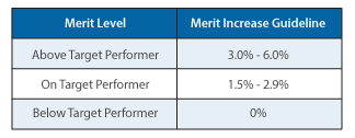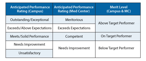 Your manager or supervisor will reference your last performance rating and use your performance since to determine your anticipated performance rating and then map that anticipated rating to one of the three merit levels: above target performer, on target performer or below target performer.
